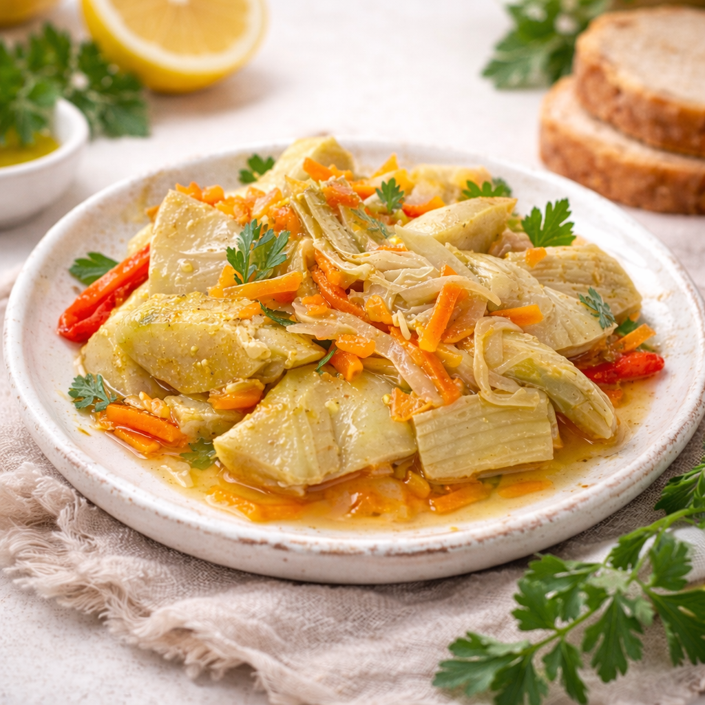 Egzotik körili sosla tatlandırılmış enginar; alışılmışın dışında ama hafif ve rafine bir lezzet.